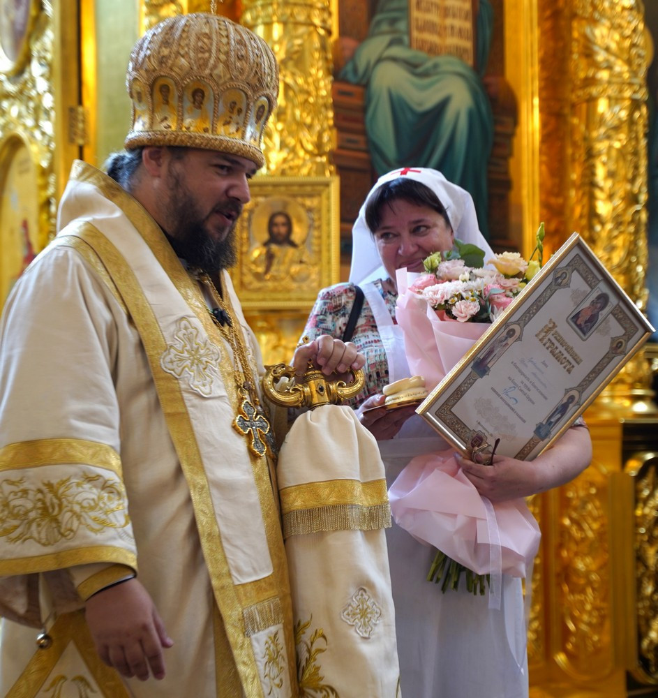По окончании Литургии владыка Антоний вручил архиерейскую грамоту Ирине Суховицыной в благодарность и благословение за труды на благо Святой Церкви.
